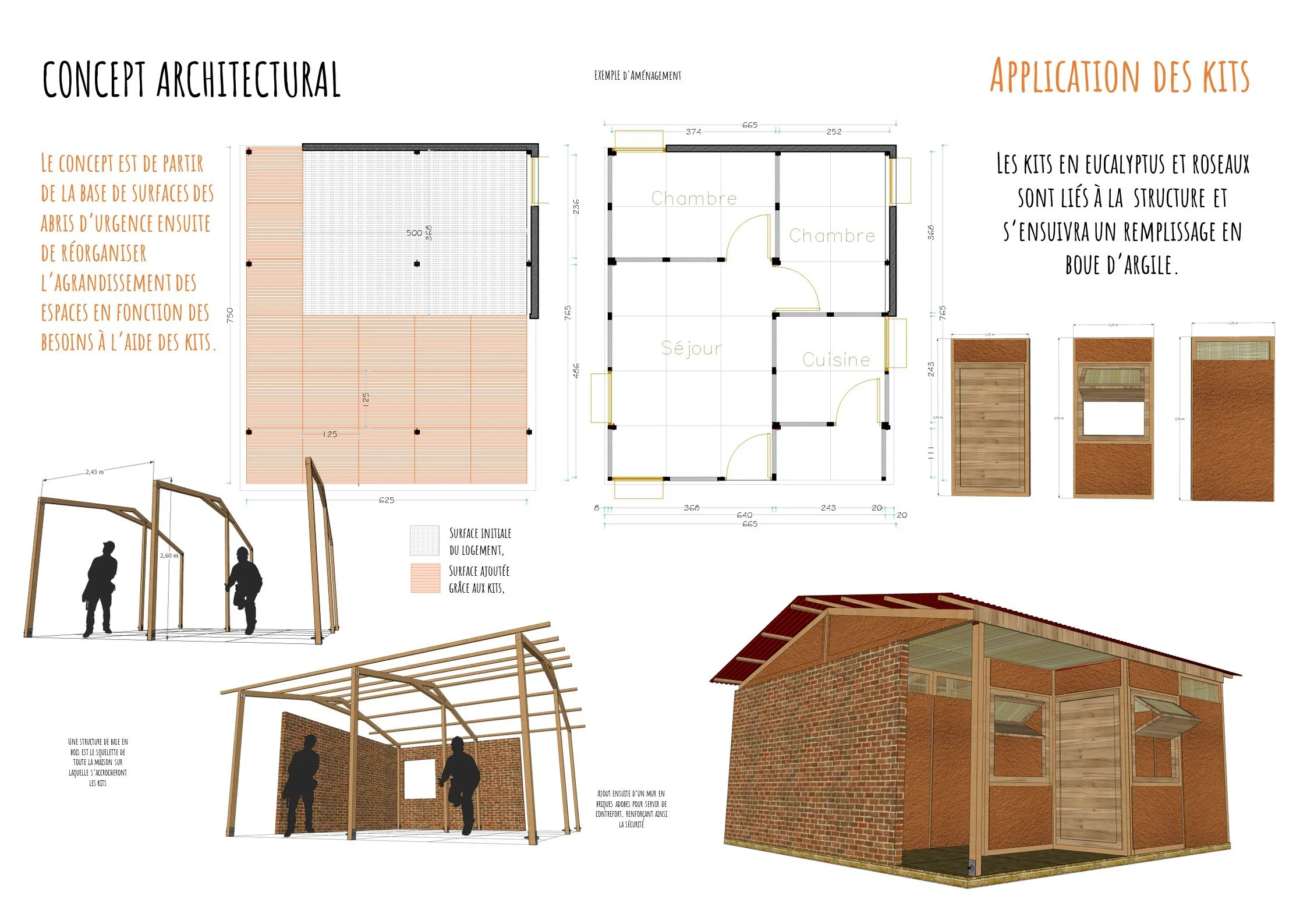Fournir des Kits de construction en matériaux locaux et durables est une solution car elle est low-cost et présente bien plus d’avantages sur le long terme et au-delà, elle introduit l’inclusivité car les organismes et les déplacés travaillent main dans la main dans l’objectif d’anéantir la précarité des logements pour les déplacés.